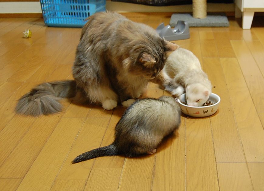 鼬も猫も食べてもよいお試しごはんをあげてる時なので、一緒に食べてます。