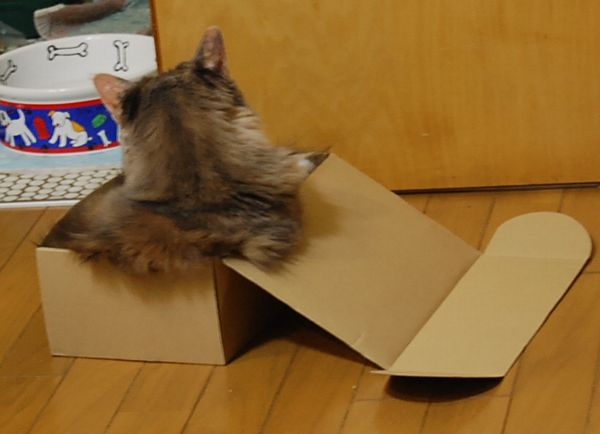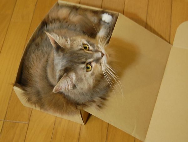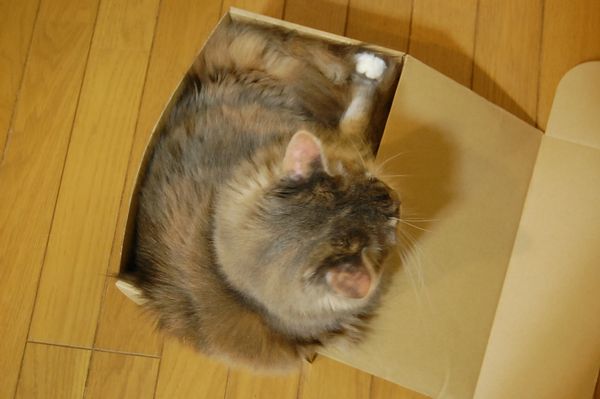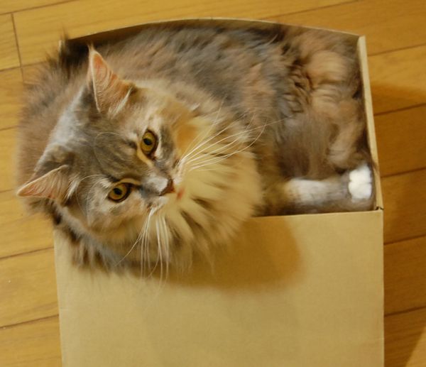 箱を見つけるとすかさず入りますが、たいていの箱は彼女には小さいので四角い猫になってます(爆)。
