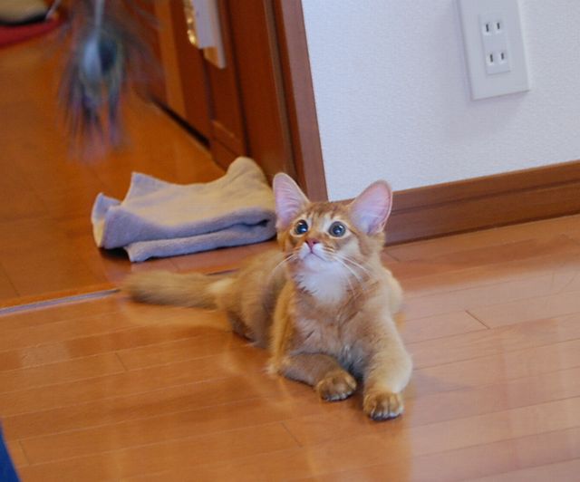 まだ来て三日目だったのもあり、少々緊張気味でしたが、おもちゃを見せると跳んできます。