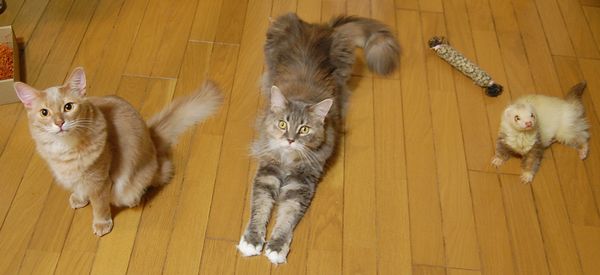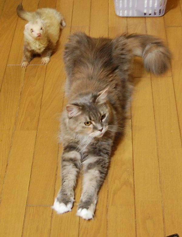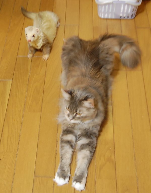 冬でも暖かい部屋で飼われてるせいか今でも毛が短めで、しかも避妊しても太らず(いいことですが)、ボディも長いので細長いので、ある意味フェレットみたいかも、、、