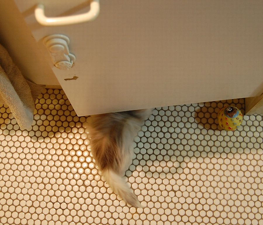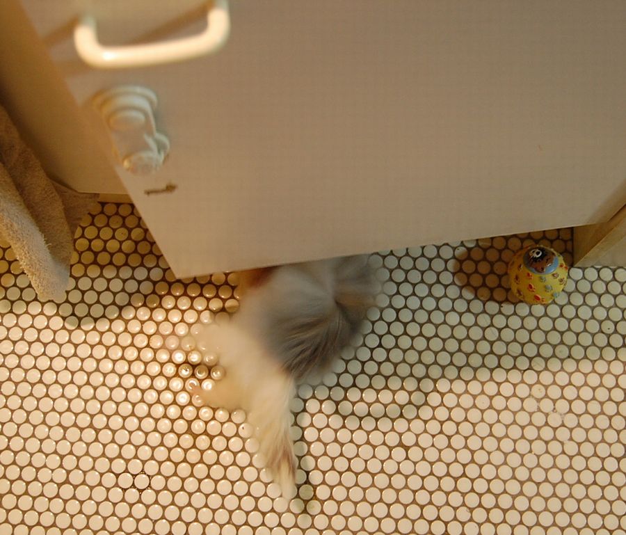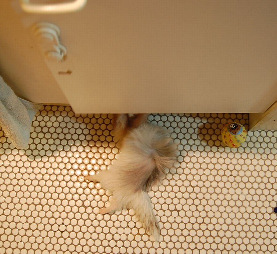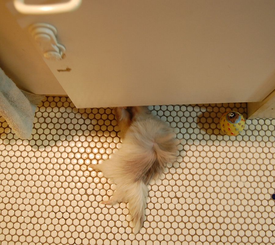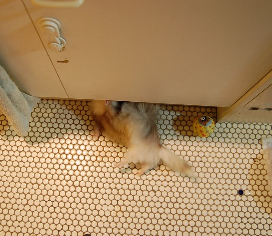 これは流しの下を開けてるところ。この後、中にある食料品を外にほっくりほっくりほじくりだして、ちらかりまくりです。